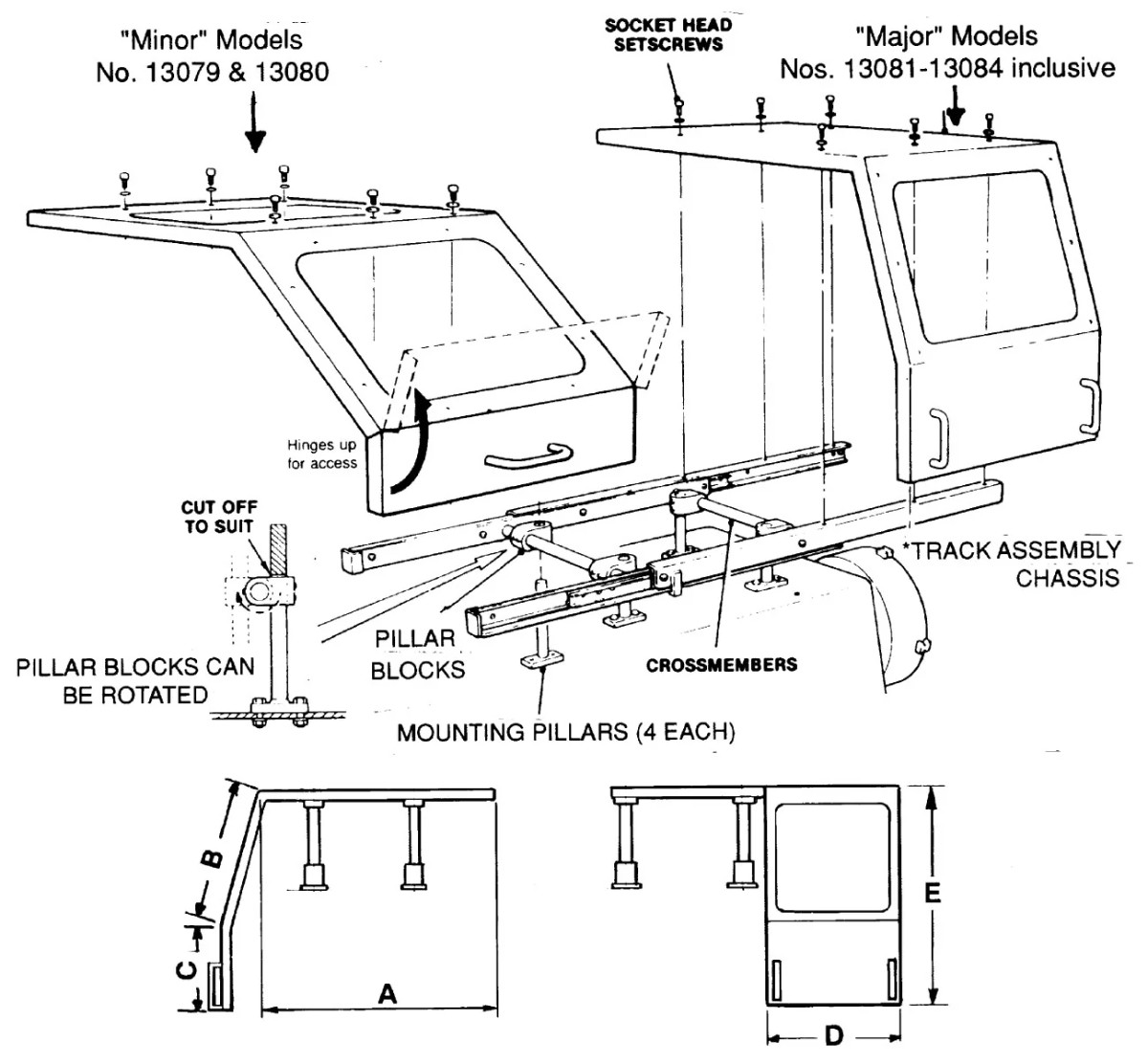 Slide-Track Latheguards are designed to guard lathe chucks ranging from 10" up to 24" diameters. These models feature two (2) ³/₁₆" thick LEXAN® windows. Being situated on the top and front inclined panels, these windows provide excellent visibility for the operator. The front panel hinges up to allow access to the controls and settings of the machine.